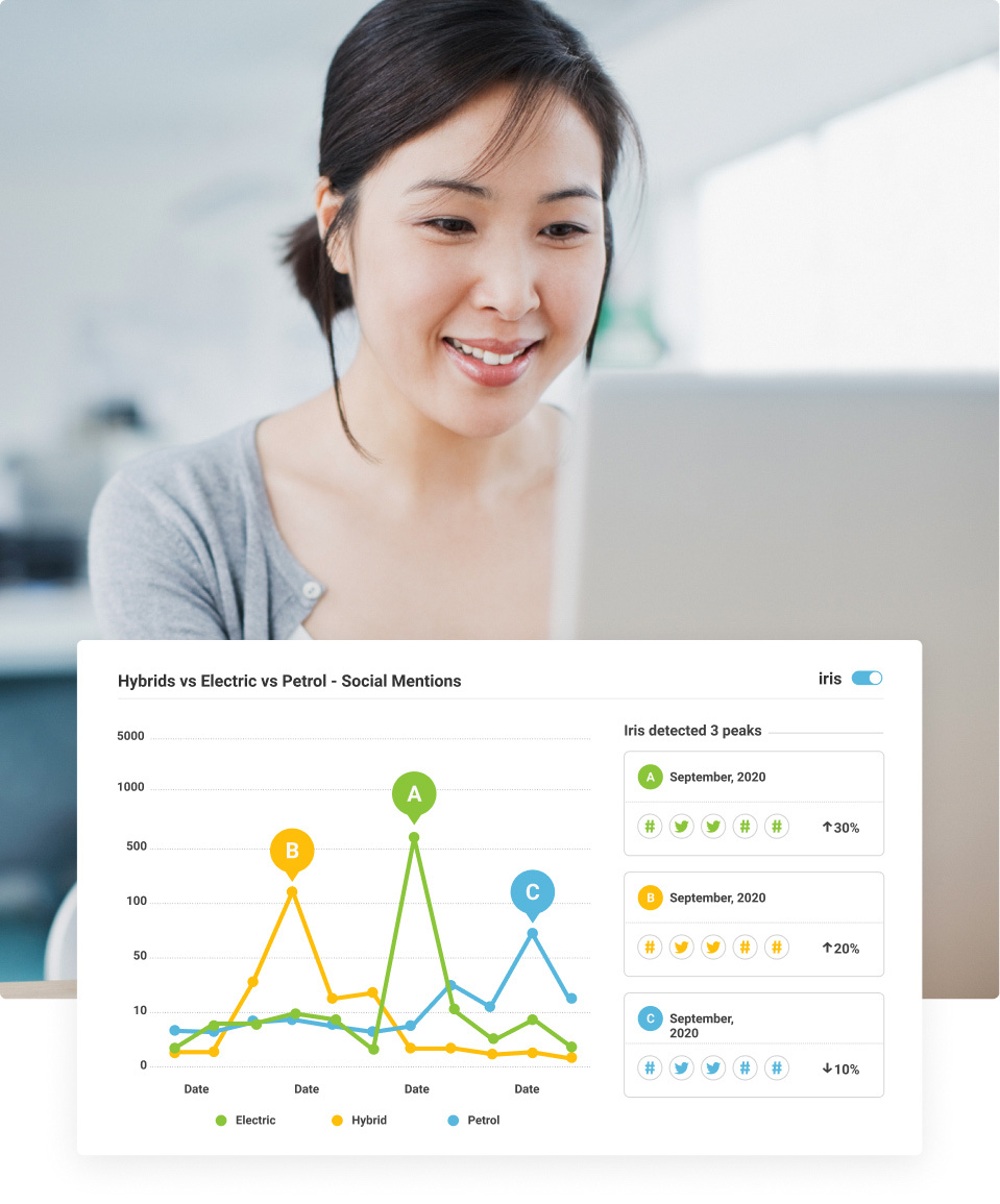 Cuando se analizan grandes conjuntos de datos, es esencial encontrar los insights rápidamente. Iris, el sistema de análisis mediante inteligencia artificial de Brandwatch, hace el trabajo más laborioso por ti y te permite obtener insights sobre tus clientes en cuestión de segundos.