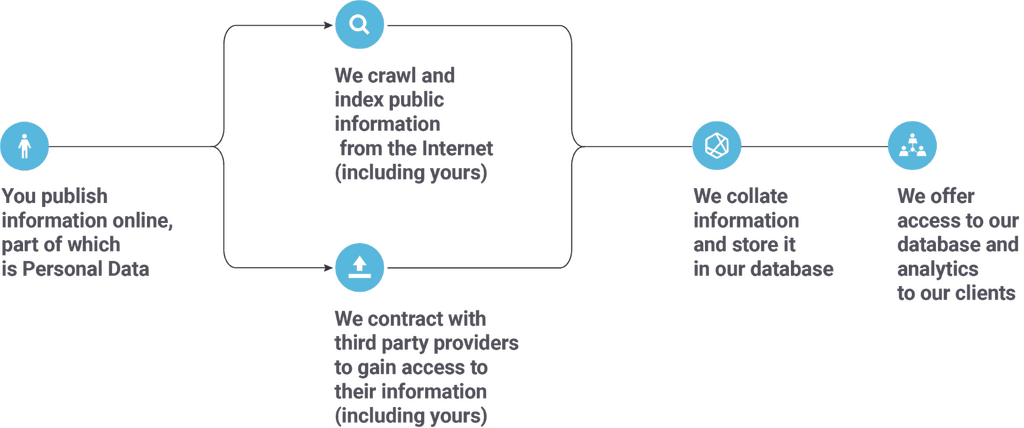We collect and collate information that is publicly available on the Internet. If you can be identified from this information, and it relates to you, then it will be your Personal Data. For example, your name or username in connection with your Twitter or Facebook profile or the content of your public posts on these sites would be your Personal Data.In a nutshell, this is how we work: we collect and index publicly available information from the Internet. We get data via search crawling or by contracting directly with content providers and data resellers to gain access to data from them. In each case, the only information that we have access to is information that Authors like you published or made available publicly.This information is then collected, indexed, and stored in our database. We offer access to our database, as well as analytics of the data within that database, to customers (our “Services”). This allows our customers to learn more about their brand, their consumers, their competitors, and act with more certainty in their marketing decisions. The following graphic depicts how our Services work.